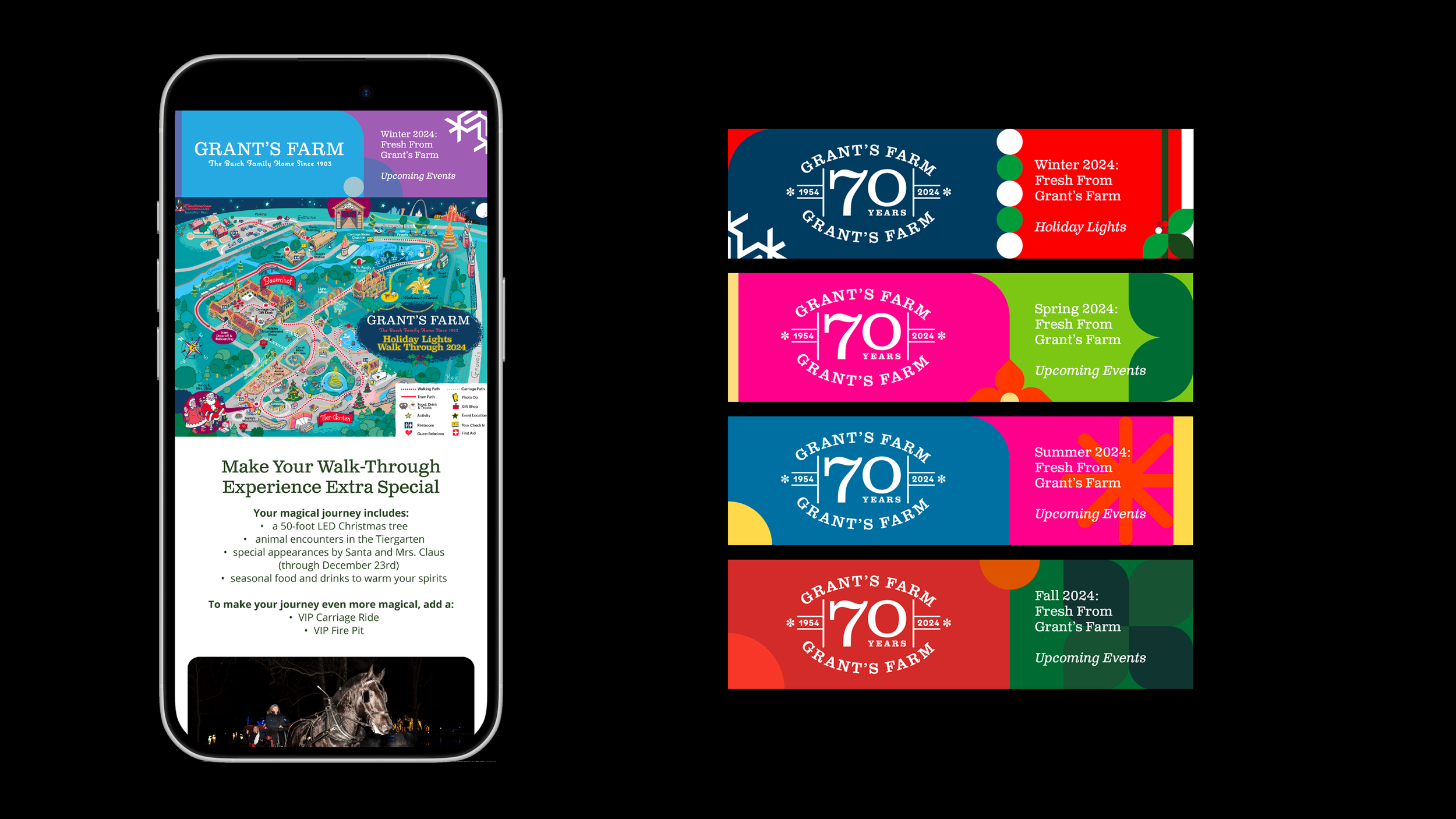 Grant’s Farm comes alive with the changing seasons, each bringing its own unique charm. Spring welcomes new beginnings, from vibrant blooms to adorable baby animals. Summer is filled with adventure-packed days and lively nights. Autumn invites crisp air, festive gatherings, and the warmth of the season. Winter transforms the farm into a sparkling wonderland of lights and magic. To capture the essence of each season, we created distinct identities for every event.